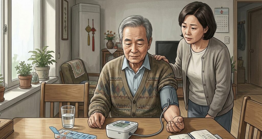 가정혈압이 중요한 이유도 여기에 있다. 노년층은 병원에 오면 긴장해 높게 나오는 경우가 있고, 반대로 집에서 아침이나 밤에 더 크게 흔들리는 경우도 있다. NICE는 진단과 관리에서 가정혈압이나 활동혈압 측정을 중시하고 있으며, 대한고혈압학회도 국내 진료지침과 교육자료를 통해 가정혈압 측정의 중요성을 꾸준히 안내하고 있다. 노인에게는 진료실에서 한 번 재는 숫자보다 집에서 반복적으로 어떻게 움직이는지가 훨씬 중요할 수 있다.
