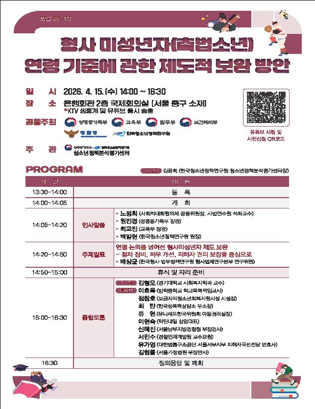 이번 포럼은 촉법소년 연령을 몇 살로 조정할지에만 초점을 맞추기보다, 현행 제도의 빈틈을 어떻게 메울 것인지에 무게를 두고 진행된다. 교육·복지·수사 분야의 현장 전문가들이 토론에 참여해 실제 현장에서 마주한 문제와 보완 과제를 공유할 예정이다.