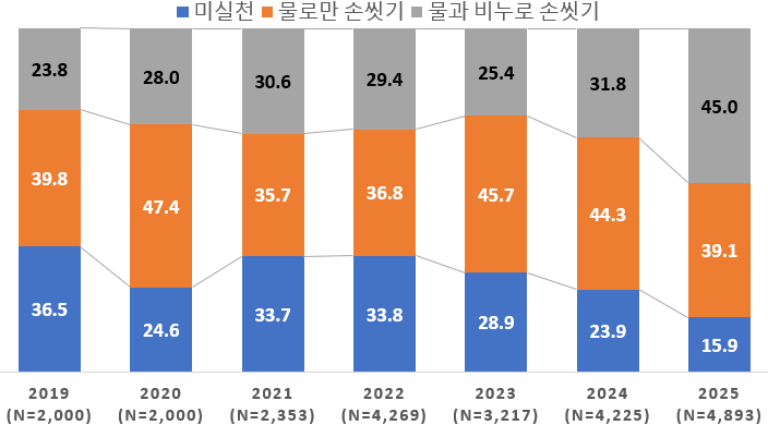 더 읽어보기질병관리청이 발표한 2025년 감염병 예방행태 조사 결과, 손씻기 실천율은 84.1%로 증가했으나 올바른 손씻기 실천율은 10% 수준에 그쳤다. 당국은 30초 이상 비누 손씻기 문화 정착을 위한 전국적 홍보 캠페인을 강화하고 있다.