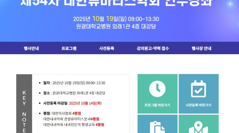 더 읽어보기대한류마티스학회가 오는 2025년 10월 19일 일요일 오전 9시부터 오후 1시 30분까지 원광대학교병원 외래1관 4층 대강당에서 제54차 연수강좌를 개최한다. 이번 연수강좌는